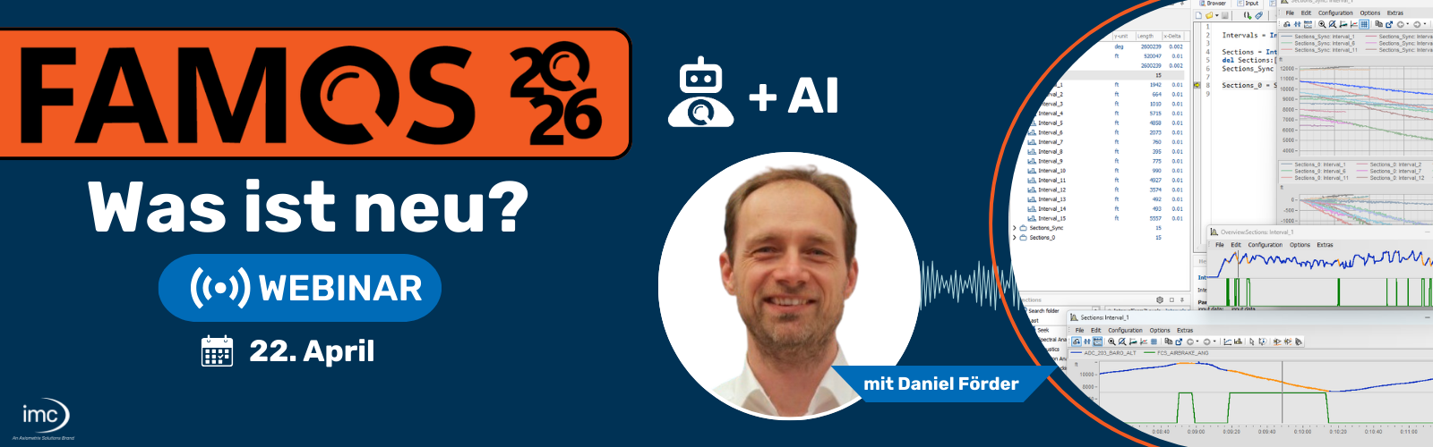 Testen Sie unsere leistungsstarke Software zur Messdatenanalyse. Egal woher Ihre Messdaten stammen: Ob vom Prüfstand, Testaufbau oder von einer mobilen Messung - imc FAMOS vereint alle Werkzeuge, die Sie zum professionellen Visualisieren und Auswerten Ihrer Messdaten benötigen.