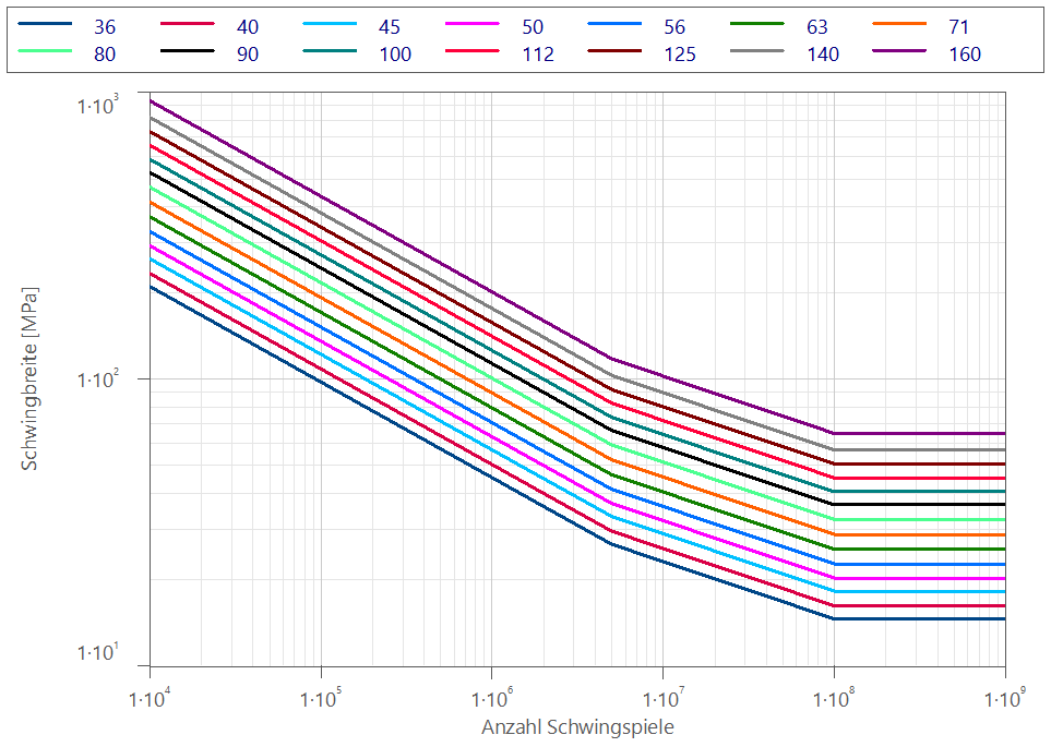 Da die Schädigung mit der Amplitude exponentiell steigt, werden SN-Kurven üblicherweise (für Metalle) doppelt logarithmisch aufgetragen. Je nach Materialart, Form des Bauteils, Richtung der Belastung u. v. m. werden sehr unterschiedliche Kurven angewandt, die entweder experimentell ermittelt, aus Materialdatenbanken entnommen oder aus Modellen abgeleitet werden. Ein Beispiel für ein solches Modell ist der Eurocode 3 bzw. die DIN EN 1993-1-9:2005 + AC:2009. Darin sind eine ganze Reihe von Kurven für sog. Kerbfälle definiert. Ein Kerbfall von 56 bedeutet dabei z. B., dass eine Schwingbreite von 56 MPa (bzw. N/mm²) statistisch gesehen nach 2.000.000 Wiederholungen einen Ermüdungsbruch erzeugt. Andere Schwingspiel-Amplituden tragen natürlich zusätzlich zur Schädigung bei.