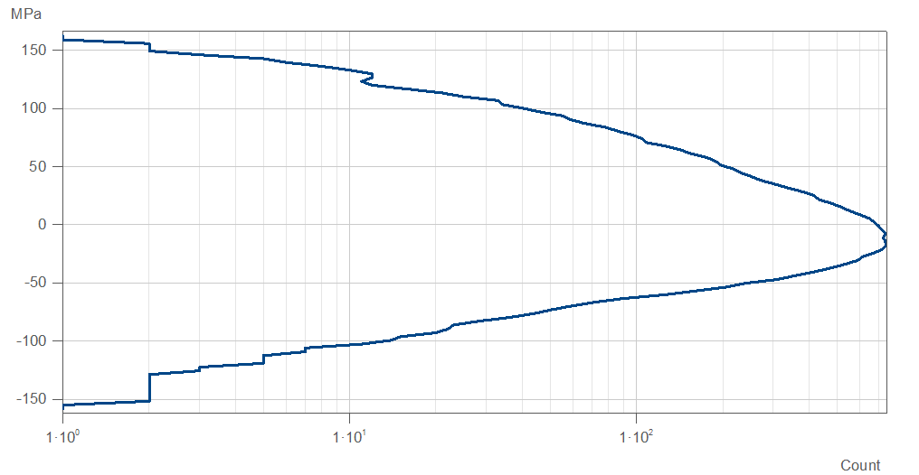 Das Ergebnis ist ein Plot, der übersichtlich zeigt, welchen Anteil der Belastungszyklen solche mit hohen Amplituden ausmachen. Die Zählung wird kumuliert aufgetragen, so dass die Anzahl bei kleiner Amplitude gleich die Gesamtzahl aller Belastungszyklen darstellt.