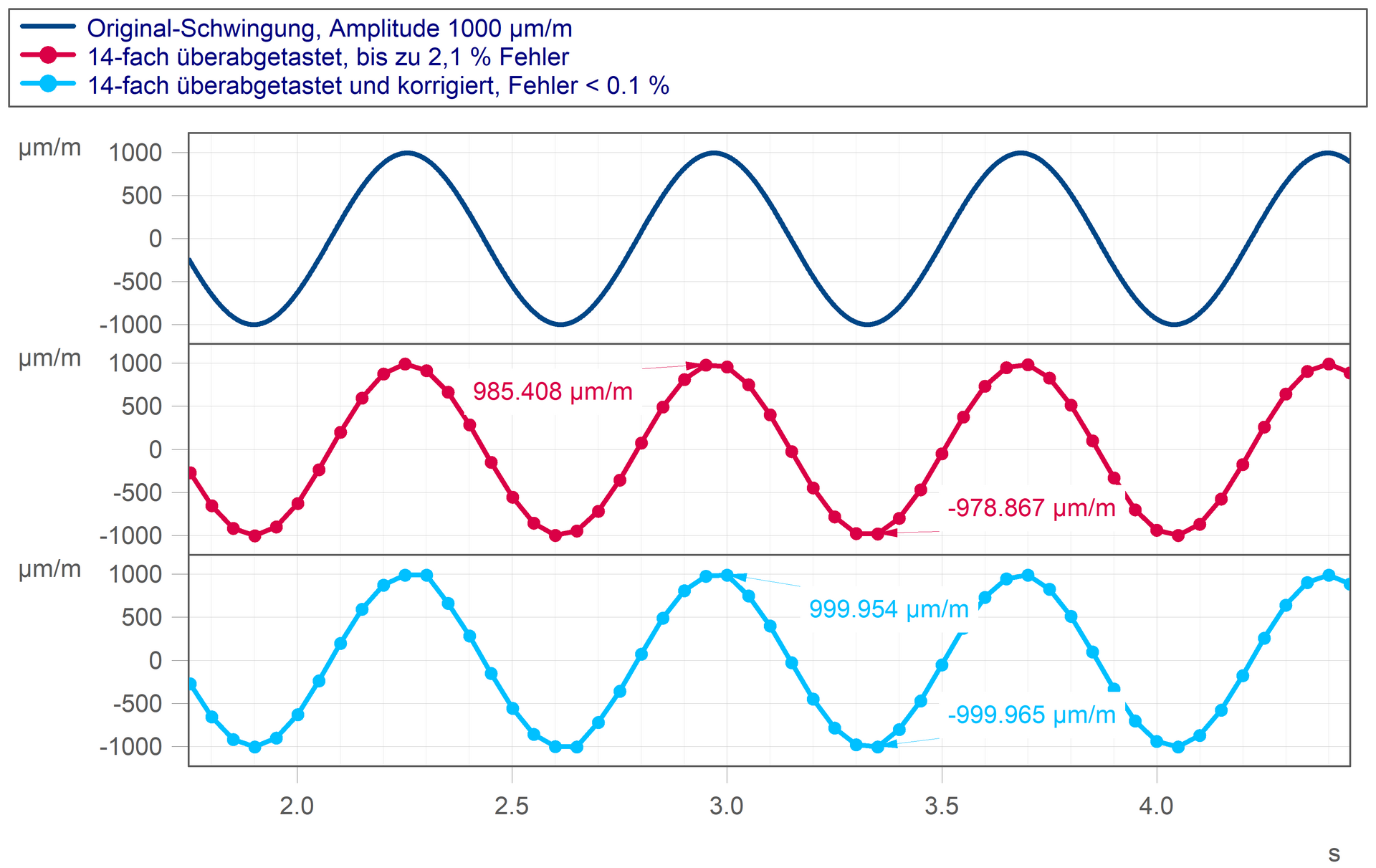 Eine entscheidende Quelle dieser Messfehler entsteht durch unzureichende Überabtastung. Je geringer das Verhältnis zwischen Abtastrate und Frequenz des Messignals ist, desto ungenauer wird der Zeitpunkt der Spitzenwerte beim Abtasten getroffen. Oftmals wird daher 100-fach überabgetastet.