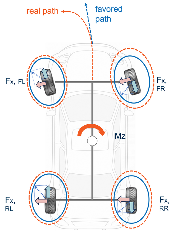 Zur Abstimmung des Fahrverhaltens von (E)-Fahrzeugen wird bei modernen Fahrzeugarchitekturen das "Torque Vectoring" immer häufiger eingesetzt. Dabei werden die Antriebs- und Bremsmomente, die an den einzelnen Rädern anliegen, unterschiedlich geregelt. Grundlage des Torque Vectoring ist die Fahrzeugdynamik, die sich mit der Querdynamik des Fahrzeugs befasst, die sich vor allem auf die Fahrstabilität, den durch seitliche Reifenkräfte verursachten Querschlupf, das Gieren und das Wanken bezieht. Weiterhin wird in Längsdynamik und Vertikaldynamik unterteilt, die das Fahren, Bremsen und den Fahrkomfort umfassen. Antriebsschlupf und Bremsschlupf werden an den Rädern in Längsrichtung des Fahrzeugs untersucht, wodurch auch die Fahr- und Bremseffizienz verbessert werden kann.