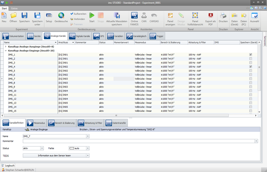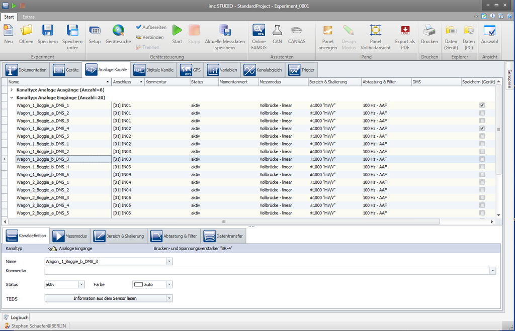imc STUDIO Setup dient zur vollständigen Konfiguration Ihrer Messaufgabe. Über eine tabellarische Darstellung erhalten Sie einen schnellen, strukturierten Überblick über ihre Einstellungen. Sortier- und Filterfunktionen helfen auch bei vielen Kanälen die Übersicht zu behalten. Gleichzeitig können Sie auf intuitive Weise die Darstellung jederzeit an Ihre Bedürfnisse anpassen und so z.B. Parameter ausblenden oder zusammenfassen, feste Einstellungen hinterlegen oder eigene Parameter hinzufügen. Tabellen-Zellen stellen übersichtlich die aktuell gewählten Einstellparameter dar und bieten beim direkten Klick sofort ein passendes Popup Menü zur Auswahl der möglichen Optionen an.