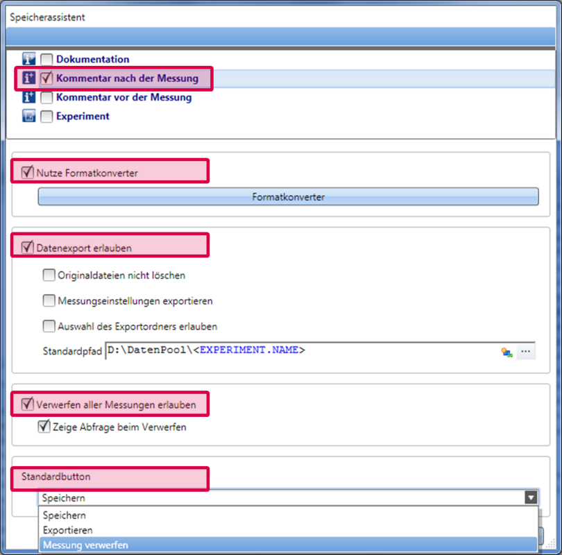 Neben dem einfachen Speichern per Checkbox steht ein erweiterter Speicherassistent zur Verfügung. Der neue Speicherassistent sorgt für mehr Komfort im Messalltag. Er fragt typische Arbeitsschritte am Ende einer Messung ab und führt diese automatisiert aus. So können Sie per Mausklick definieren: