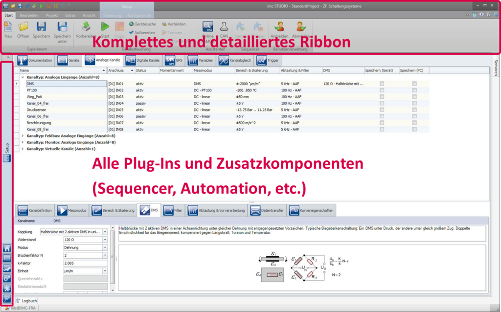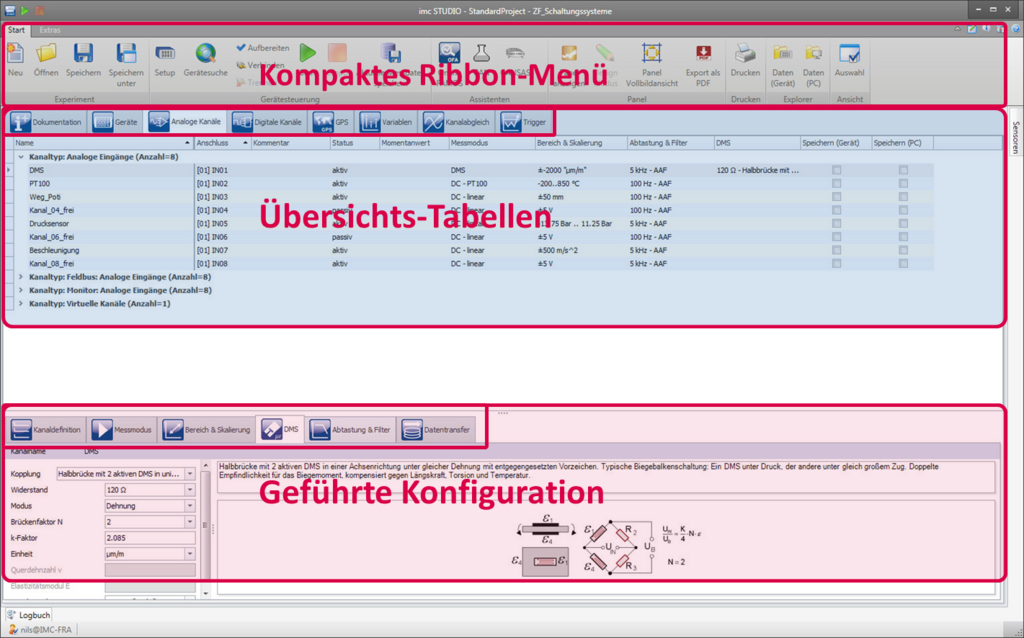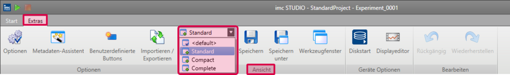 Bei der neue Bedienoberfläche von imc STUDIO passen sich die Menüs automatisch an - je nach eingesetzter Messhardware.